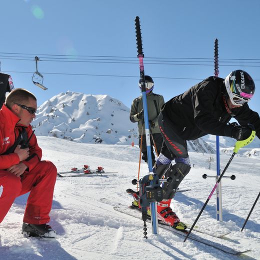 esf Belle Plagne en collaboration avec esf Bellecote gère le stade du Dahu au-dessus de Belle Plagne. L’ensemble du cours se déroule dans cet espace sécurisé vis-à-vis des autres utilisateurs et dédié aux compétiteurs. Du matériel de chronométrage est présent pour pouvoir évaluer les performances.